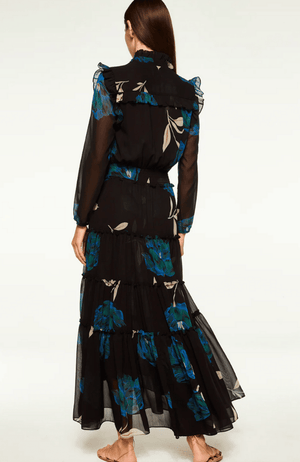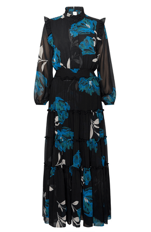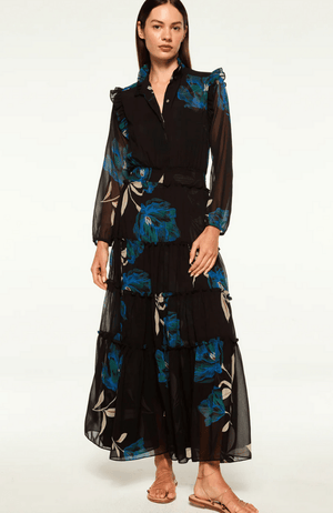 Introducing the ARHEA DRESS, a luxurious and versatile shirt dress crafted from exquisite Nightshade Flora chiffon. With delicate ruffle details on the collar and shoulders, and sheer blouson sleeves, this dress exudes elegance. The smocked elastic waist and maxi skirt with ruffle hem will flatter your figure. A perfect transitional piece for any occasion.
