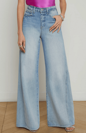 Discover the must-have BEAU WIDE LEG JEAN in FONTANA, as seen in Spring '25 NYFW. A perfect fit for all body types, this high-rise style features a twisted seam for figure-flattering effect. Crafted from all-cotton denim and finished with a light wash.
