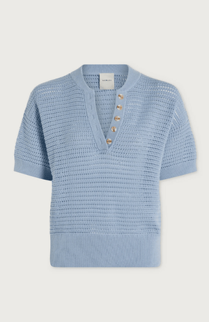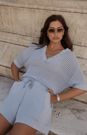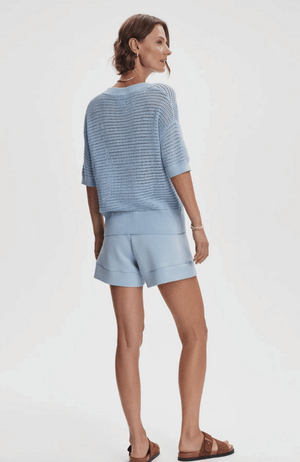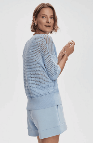 Expertly crafted from lightweight cotton mesh knit, the CALLIE KNIT TOP in CASHMERE BLUE offers an oversized, boxy silhouette with a deep V-neckline and dropped shoulder design for a relaxed fit. Perfect for both active and everyday wear, this top exudes effortless elegance.