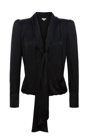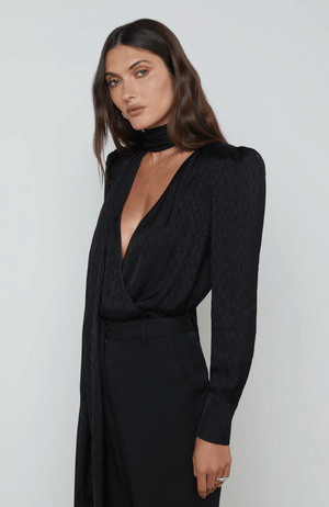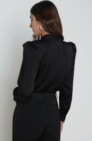 Elevate your wardrobe with our CAMBRIA TIE NECK BLOUSE in BLACK. Featuring exaggerated puff shoulders and a deep V-neckline, our blouse effortlessly adds subtle curve definition. The JACQUARD satin fabric adds a touch of elegance to this chic piece. Perfect for any occasion, this blouse is a must-have for any fashion-forward individual.