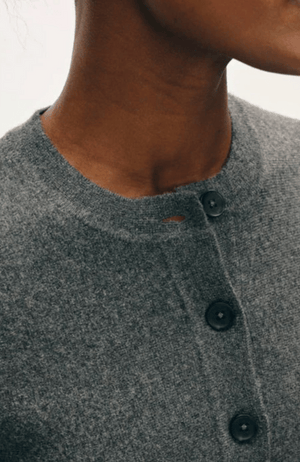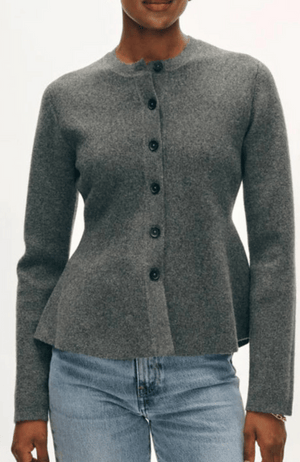 Elevate your wardrobe with this sophisticated dark granite cardigan crafted from a luxurious 100% cashmere blend. Featuring a flattering peplum silhouette, it gracefully defines your waist while offering unmatched softness and warmth. Perfect for layering, this timeless piece brings elegance and comfort to every occasion.