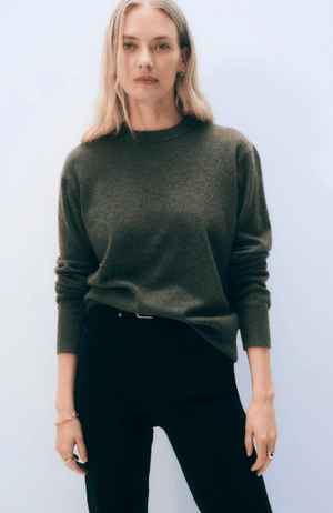 Elevate your wardrobe with this sophisticated crewneck sweater in Thyme Heather. Made from pure cashmere, it offers exceptional softness and warmth. The finely ribbed trims and subtle center-back detail add refined touches, while the longer, relaxed fit ensures effortless comfort and timeless elegance. Pairs perfectly with the Cashmere Travel Wrap in Thyme Heather.