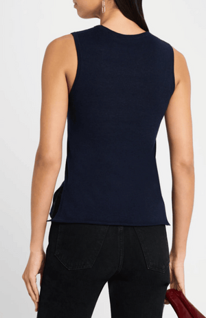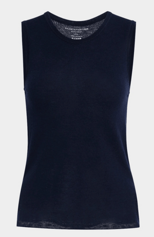 Indulge in luxury with our Machine Washable Cashmere Tank in Marine Navy. Made with Majestic Filatures' innovative machine-washable cashmere technology developed for Loro Piana, this knit sweater boasts a crew neckline, sleeveless design, and hem side slits for a relaxed fit and easy pullover style. Machine wash cold for effortless care.