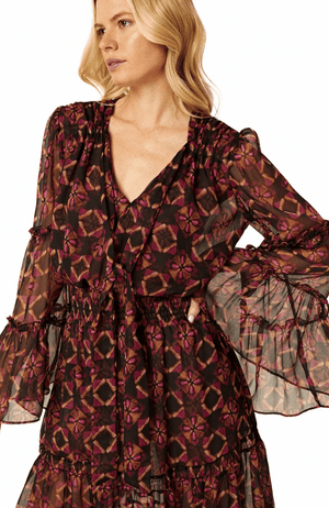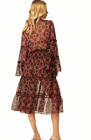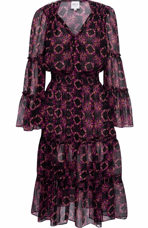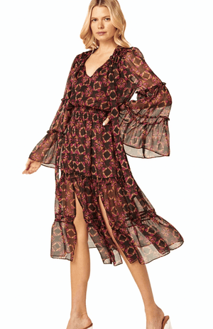 The Celeste midi dress is handcrafted from a gorgeous prism print chiffon. Featuring bold, feminine long sleeves, v-neck, lavalliere tie and a slit up the right leg. This effortlessly chic piece features an elastic waistband where the elegant top and modern skirt meet.