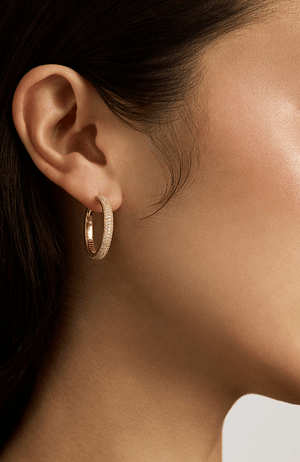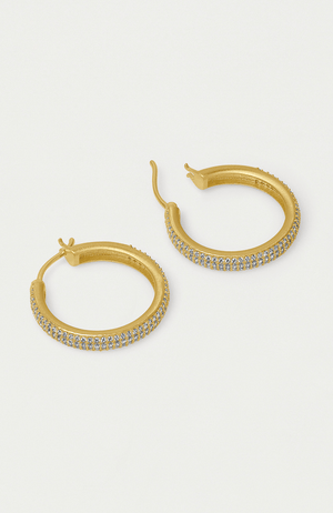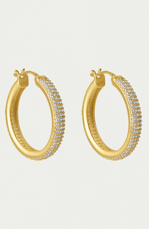 Elevate your elegance with the Giselle Pave Hoops, crafted in rich 22 karat brushed brass for a luxurious yet modern finish. These hoops combine classic charm with a glamorous edge, featuring delicate pave detailing that catches the light with every movement. Perfect for making a refined statement, they seamlessly blend sophistication and sparkle for any occasion.
