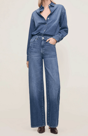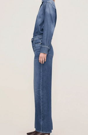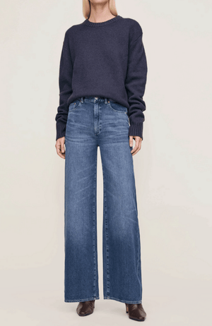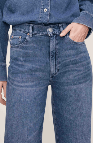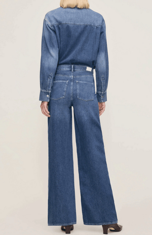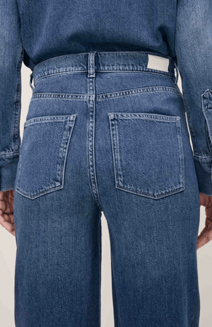 The Hepburn Wide Leg in Del Ray offers a sophisticated silhouette with its high-rise fit that contours the waist and seat before elegantly flaring from the thigh. Crafted in a vibrant indigo wash, it features refined details such as silver buttons, copper rivets, and khaki stitching. The clean hem and subtle ecru back patch complete this timeless design, perfect for a polished yet contemporary look. With a 32" inseam, these jeans balance classic shape and standout character effortlessly.