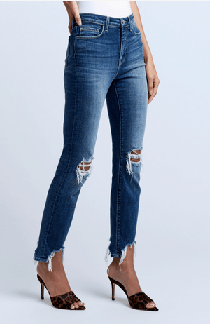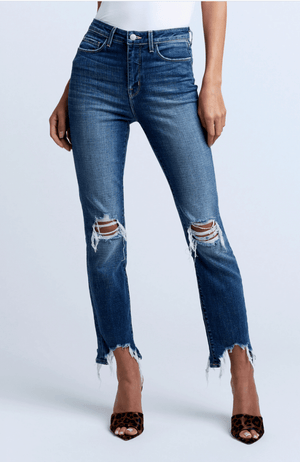 A high-rise slim straight-leg jean in medium blue with vintage-style fading. The premium denim, with its subtle stretch, hugs from the contoured waistband through its slightly tapered straight leg to its raw high-low hem. Features tears at the knees, five-pocket construction and zip fly closure.