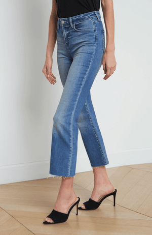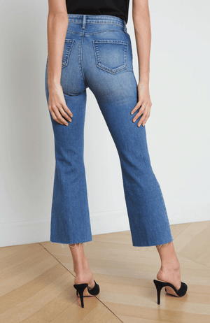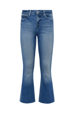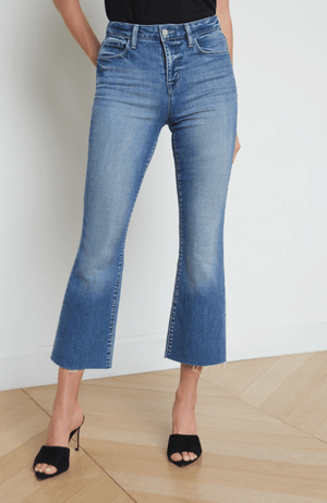 As a classic L'AGENCE piece, the Kendra Cropped Flare Jean in Laguna offers a 26" inseam and contoured waistband for a perfect fit. Its subtly flared cropped leg accentuates the waist, making it ideal for petites and cropped jean lovers. No tailoring is required, making it a convenient wear-now option.