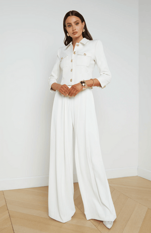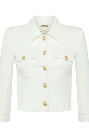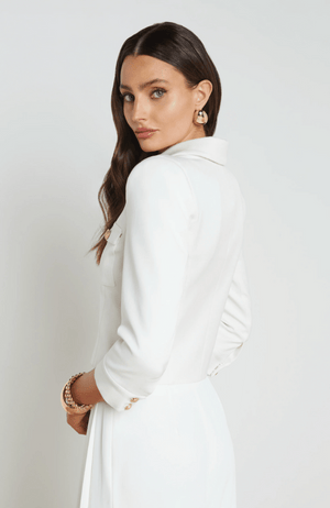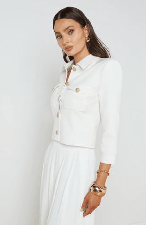 The Kumi Cropped Jacket in White redefines elegance with its modern twist on the classic three-quarter sleeve design. Featuring a strong shoulder line and a tapered silhouette, it offers a flattering, structured fit. Crafted from supple stretch-suiting fabric, this jacket combines comfort and refinement. Signature gold-embossed dome buttons and flap pockets add timeless detail, making it a versatile piece that pairs effortlessly with high-waisted denim for a chic, balanced look.