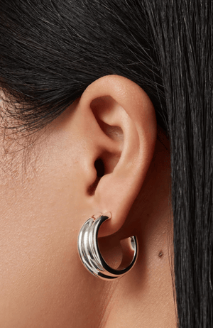 Elevate your look with the Lennon Hoop Earrings in Silver, featuring deep contoured design that adds dimension and elegance. Paired with Flat Disc Earring Backs, these hoops ensure comfortable all-day wear. Finished in high-polish silver, they offer a refined shine that complements any outfit with understated sophistication.