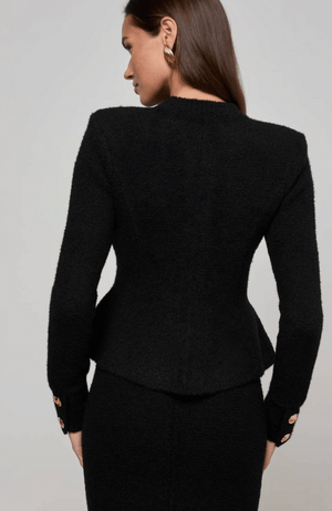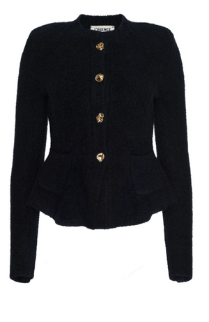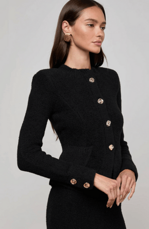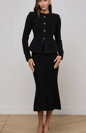 The Melissa Knit Flare Cardigan in Black offers a refined blend of softness and structure. Crafted in a textured knit, its sculpted waist and flared hem elegantly enhance the silhouette. Featuring a clean neckline and subtle vintage-inspired charm balanced by modern accent buttons, this cardigan exudes timeless sophistication. Pair it with the coordinating skirt and heels for a seamlessly polished ensemble.
