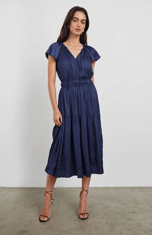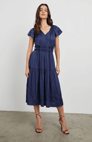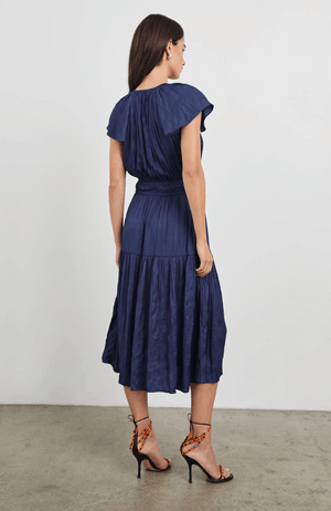 The Mirielle Dress in Admiral Blue is crafted from luxurious crinkle satin, offering a graceful, free-flowing silhouette. Its shirred waist enhances the figure subtly, while delicate neckties and flutter sleeves add refined, feminine details. Perfect for elegant occasions, this dress combines comfort with timeless sophistication.