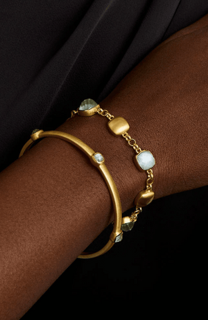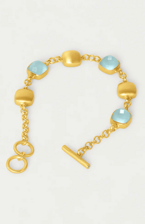 Indulge in the luxury of our MONTEREY CHAIN BRACELET, featuring square checkered-cut iridescent sky blue gemstones on a gold rolo chain. The handcrafted doublet technique adds a touch of extra iridescence, making this bracelet a statement piece for any occasion. Made with high-quality brushed gold plating over brass.