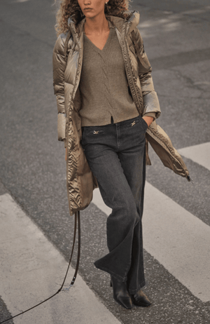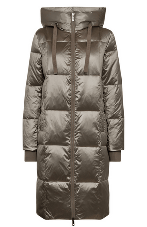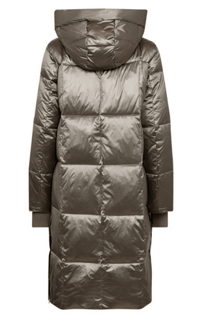 This knee-length down jacket combines sophistication with functionality. Crafted from striking metallic fabric, it features a cool rectangular quilted pattern, a high collar with a hood for added warmth, and side slits that ensure effortless movement. Filled with responsibly sourced down, this piece offers both style and sustainable comfort for colder days.