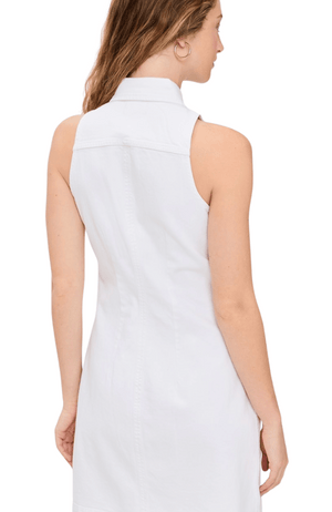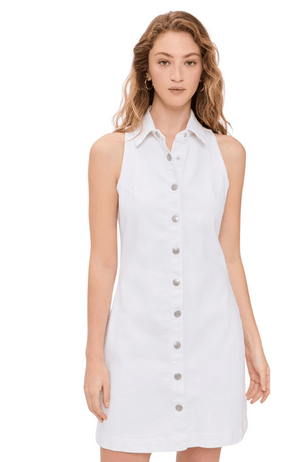 Introducing Payton, the perfect blend of style and comfort. This sleeveless denim mini dress boasts a tailored silhouette with a point collar and front button closure for a chic and polished look. Embrace fashion-forward dressing with this versatile and flattering white dress.