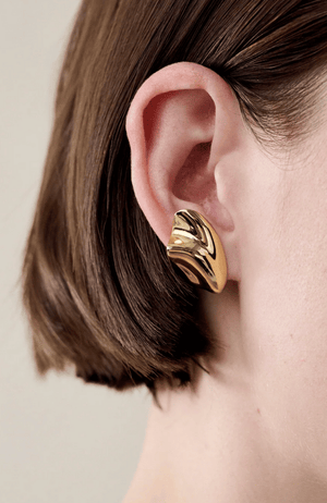 These PORTIA EARRINGS in GOLD feature a sculptural mid-sized button design inspired by the natural elegance of scalloped seashells. Crafted with a high-polish gold finish, they offer versatile styling—wear them climbing up the ear or fanning gracefully down and out for a refined, sophisticated look. Perfect for adding a subtle yet striking touch to any ensemble.