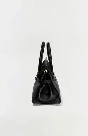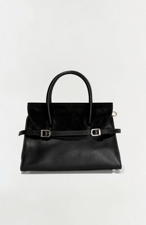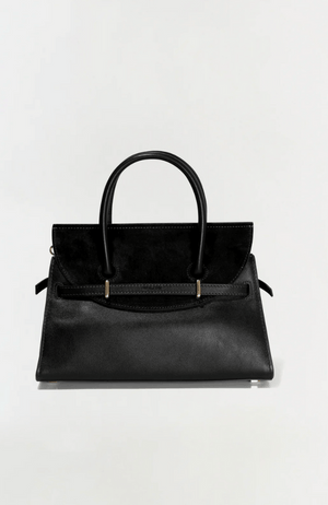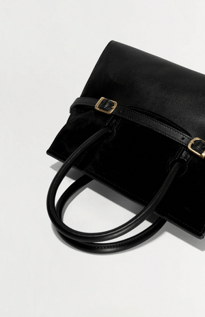 The River Handbag Mini in Cacao combines smooth leather with soft suede for a refined yet approachable look. Its structured silhouette is enhanced by elegant gold-tone buckles, making it a versatile accessory that elevates any outfit while staying compact and practical.