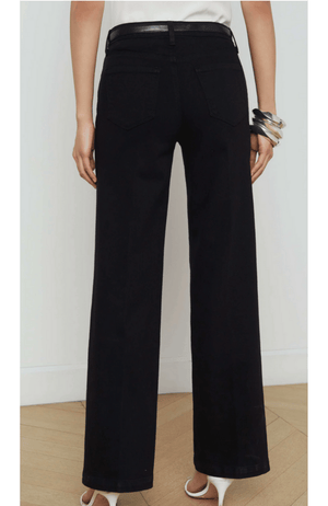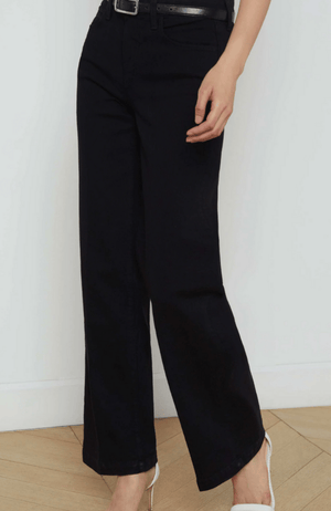 The Scottie Wide Leg in Black offers a refined silhouette with its high-rise, wide-leg design that flatters the hips while providing comfort. Crafted from premium stretch denim, it ensures a smooth fit without gaping thanks to its contoured waistband. Featuring a classic five-pocket style and secure zip fly with button closure, this timeless jean balances elegance with everyday wearability.