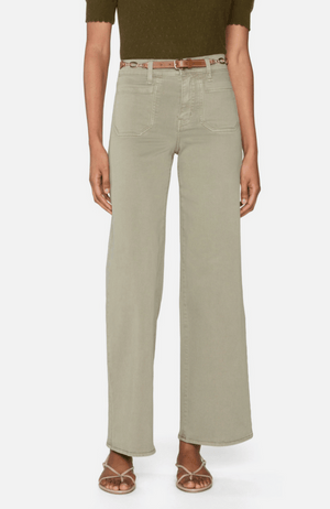 Elevate your wardrobe with our SLIM PALAZZO MODERNIST POCKET in THYME. This sophisticated silhouette features a flattering high rise, fitted hip, and subtle wide-leg flare that gracefully extends to the floor. Distinguished by chic front pocket details, this light sage pair is meticulously crafted from a sustainable, ultra-stretch cotton blend, ensuring both environmental consciousness and exceptional comfort throughout the day.