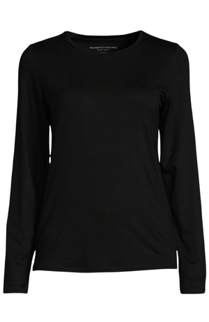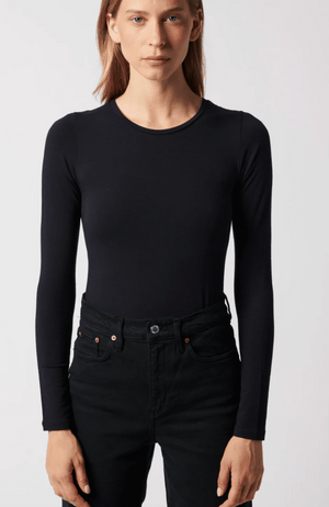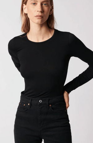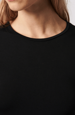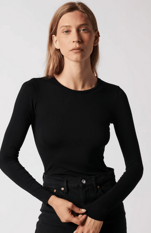 Elevate your wardrobe with this SOFT TOUCH long sleeve crew neck tee in Noir, tailored for a flawless second-skin fit. Crafted from an exquisite blend of premium French fibers and meticulously produced in Europe, it offers unmatched softness, durability, and resistance to pilling, fading, stretching, and wrinkling. Lightweight yet luxurious, this tee remains colorfast and antimicrobial, making it the perfect, sophisticated layering piece that maintains its pristine look and feel wear after wear.