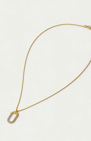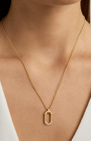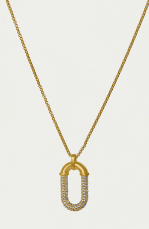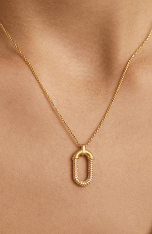 The Solene Pave Pendant Necklace features a refined industrial design softened by delicate pavé cubic zirconia accents that shimmer against a brushed 22 karat gold-plated brass base. Expertly crafted and beautifully balanced on an everyday chain, this piece offers effortless elegance that elevates any outfit with subtle sophistication.