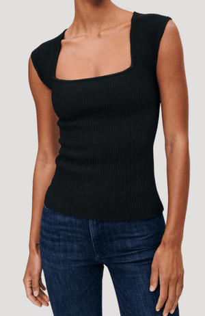 This black square neck top features wide straps and a ribbed texture for a refined, modern look. Crafted from stretch cotton, it offers a comfortable fit that moves with you while maintaining its shape. Designed to be true to size, this versatile piece combines simplicity with elegance, perfect for elevating any outfit with understated sophistication.
