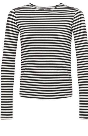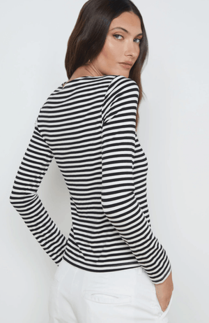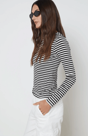 Experience unparalleled softness with the Tess Crew Neck in Stripe. Crafted from lightweight rayon jersey, this slim-fit long sleeve tee offers a refined silhouette that effortlessly transitions from layering essential to standalone statement. Its classic crewneck design adds timeless elegance, making Tess a sophisticated choice to elevate your seasonal wardrobe.