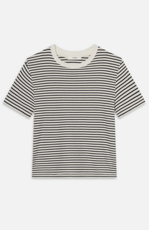 Enveloped in luxuriously soft cotton, this navy multi-striped baby tee offers refined simplicity with elegant appeal. The thoughtfully tailored shrunken silhouette creates a sophisticated profile that pairs effortlessly with premium denim for an elevated everyday ensemble. A quintessential wardrobe staple that transitions seamlessly from casual daywear to polished evening attire.