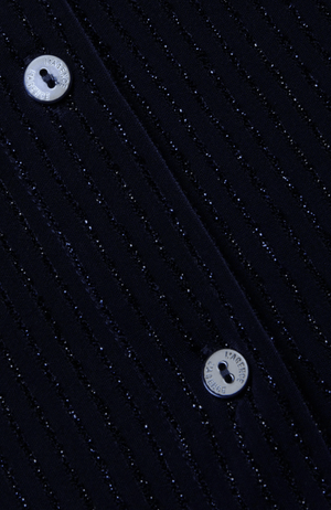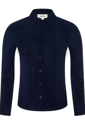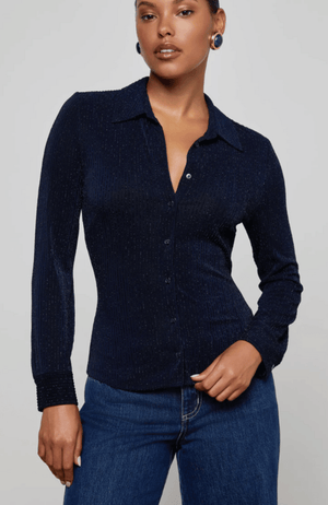 The Indiana is a fitted button-down in midnight navy, elevated with metallic pinstripes that catch the light with every movement. Tailored for a flattering silhouette, this versatile piece transitions effortlessly from polished office wear to sophisticated evening style. The bracelet-length sleeves and refined button closures complete a design that works as hard as you do—whether you're commanding the boardroom or stepping out for an elegant night out. • Metallic striped knit • Bracelet-length sleeves • Fitted silhouette • Button closures