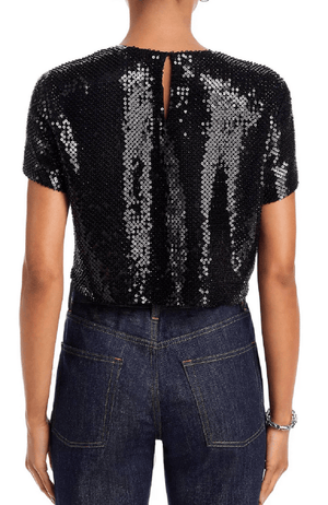 Elevate your evening look with this sophisticated sequin flutter top. Featuring a graceful scoop neckline and delicate flutter sleeves, it's adorned with shimmering sequin embellishments that catch the light beautifully. The keyhole and button closure at the back adds an elegant touch of detail. Designed to fit true to size, this piece measures approximately 19.5" from shoulder to hem in size S/4, making it perfect for layering or wearing solo.