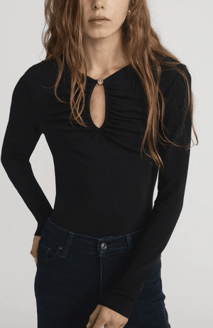 THE KEYHOLE TOP in BLACK Effortlessly alluring, this form-fitting jersey spandex top balances sensuality with refined elegance. The signature peek-a-boo keyhole detail at the neckline creates an intriguing focal point, while the gold knot button closure adds a luxe finishing touch. Designed to move with you, this versatile piece transitions seamlessly from day to evening, embodying the understated sophistication that defines the collection.