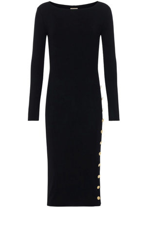 Cut from ultra-soft, stretch modal, the Astra Midi Slit Dress in Black offers a figure-flattering fit with a refined boat neckline. Its high side slit adds an alluring touch, complemented by elegant gold-tone buttons for subtle sophistication. This stretch rib dress balances minimalist design with modern appeal, making it a versatile piece that seamlessly transitions from day to night occasions.