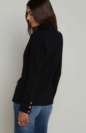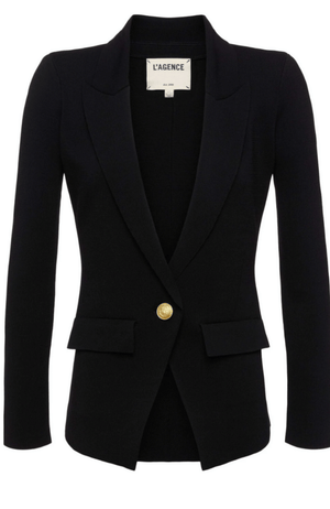 Crafted from lightweight stretch knit fabric, the CHAMBERLIAN KNIT BLAZER in black offers effortless sophistication and comfort. Its strong, structured shoulders create a polished silhouette, while flap pockets add refined detail. Finished with an embossed dome button closure, this versatile blazer elevates any outfit with understated elegance.