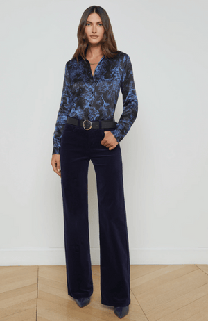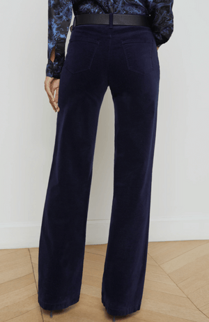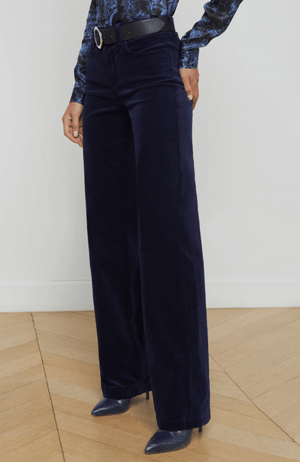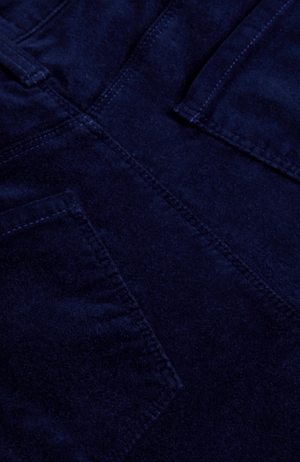 This soft, lightweight velvet jean features a tall, wide-leg design that is both fitted and flattering through the hips. Experience all-day comfort and effortless style in the Clayton High Rise Wide Leg Velvet Jean in midnight blue. Perfect for any occasion•