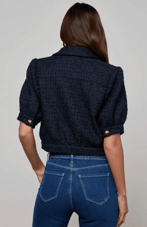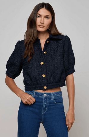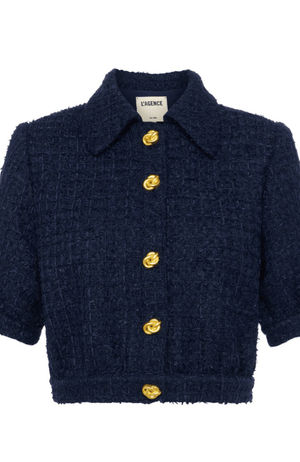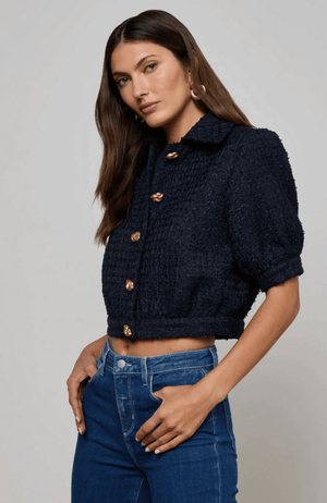 Elevate your wardrobe with the Cove Crop Jacket in Midnight, featuring an ultra-feminine cropped silhouette and elegant puff sleeves. Crafted from textured waffle tweed and fully lined for comfort, this versatile piece transitions effortlessly between a chic jacket and a stylish top. Finished with distinctive knot gold buttons, it adds a refined touch to any ensemble. Pairs perfectly with the Lexi cami in midnight.