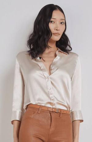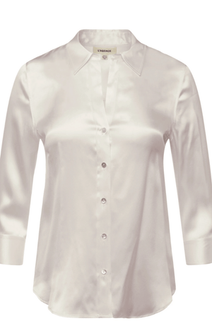 A classic button-down blouse with a luxurious, light catching luster. Charmeuse silk in soft ivory drapes effortlessly to a shorter, curved hem. Three-quarter-length sleeves and a relaxed open collar balance elegance with wearability. 100% silk.