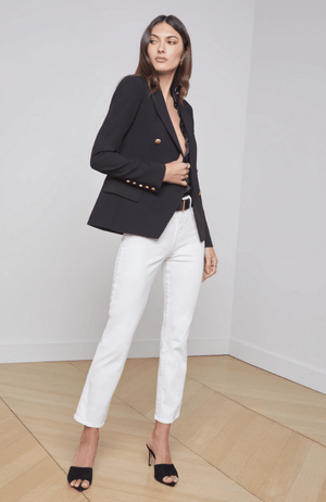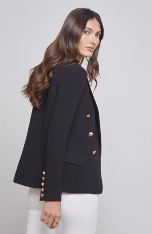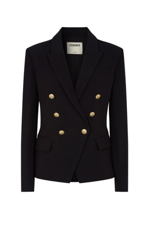 An expertly crafted double-breasted blazer in black. Smart, tailored construction features strong shoulders, peaked lapels, seamed flap pockets, and a fitted, tapered waist. Detailed with six domed buttons in gold. Double button closure, fully lined. Always in stock, if you don't see your size email us and we can order it.