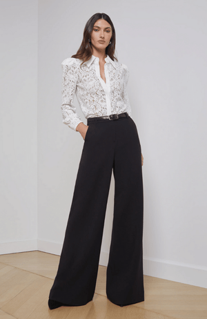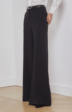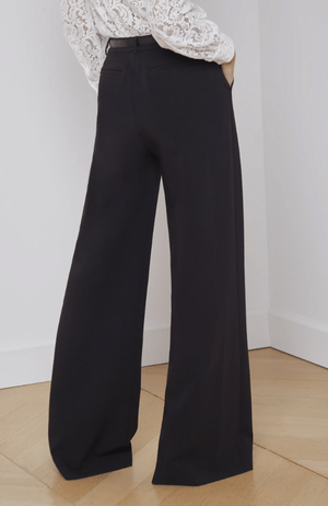 A high-rise, true black pant with a statement-making wide leg. Dramatic hemline contrasts and accentuates a slim, defining waistband that features a hidden hook-and-bar closure. Understated slit pockets blend seamlessly into the draped silhouette.