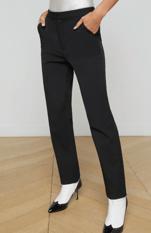 Introducing the REBEL TROUSER in BLACK by L'AGENCE. This classic straight-leg trouser features a clean waistband and minimalist cut, crafted from Italian 4-way stretch suiting for the perfect fit. Look and feel confident in this expertly tailored, versatile piece.
