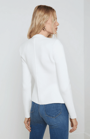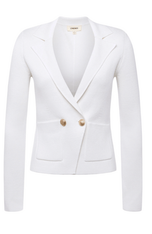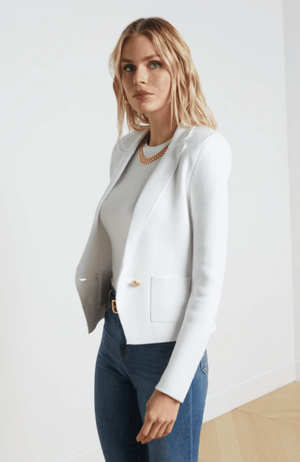 Expertly crafted, the Sofia Knit Blazer in pure white boasts a premium knit fabric and tailored details such as sleek lapels and patch pockets. The double-breasted design creates a flattering silhouette, while the gold embossed-dome buttons add a touch of sophistication. Elevate your wardrobe with this feminine and stylish blazer.