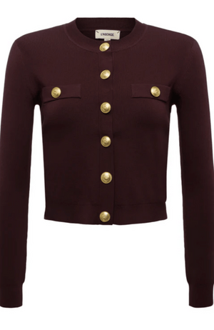 This elegant cropped crew-neck cardigan in a rich chocolate hue offers a refined silhouette with its supple power knit fabric. Designed to gracefully fall from structured shoulders to a tailored cropped waist, it features faux welt pockets adorned with luxurious gold embossed-domed buttons, complemented by a matching front button closure for a polished finish. Perfect for enhancing any sophisticated wardrobe.
