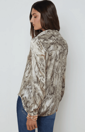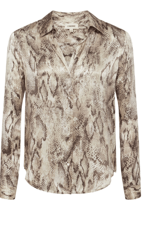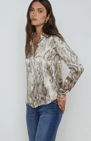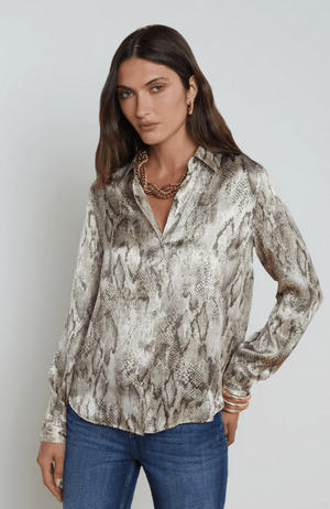 Discover the versatile TYLER SILK Blouse in Tan Multi Snake, a must-have staple for any wardrobe. Crafted from luxurious silk, this iconic button-down offers endless styling options. With a chic neutral color and trendy snake print, elevate your look with this timeless piece. Perfect for any occasion