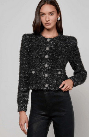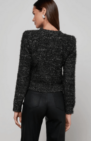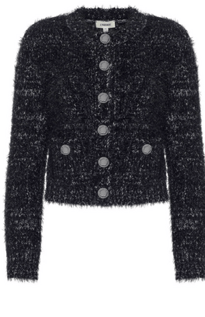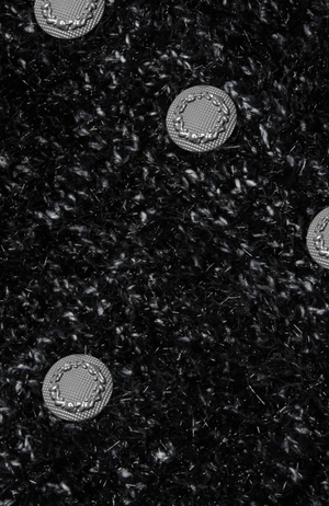 The Una knit cardigan in black with gunmetal lurex offers a sophisticated blend of cozy texture and subtle shimmer. Its plush fabric woven with metallic threads adds a refined edge, while the cropped silhouette and embossed silver buttons elevate the design. Ideal for layering over a silk camisole or pairing with denim, this cardigan seamlessly balances comfort and elegance for versatile, polished looks.