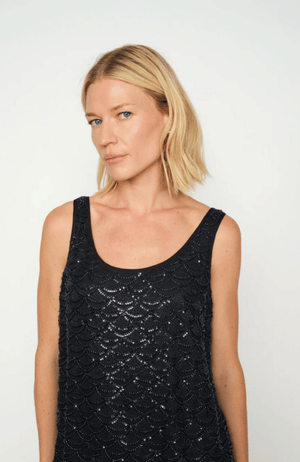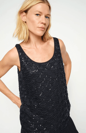 This embellished top is designed to dazzle. Cut in a flattering silhouette with a rounded neckline and sleeveless shape, it features a stunning scalloped bead and sequin pattern that adds rich texture and refined sparkle. The deep navy hue keeps the look elegant and versatile. Pair it with tailored pants or a sleek skirt for an elevated evening outfit — or layer under a blazer to add a touch of glamour to your look.