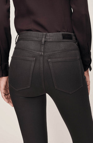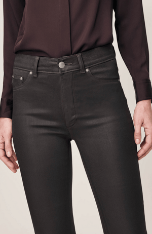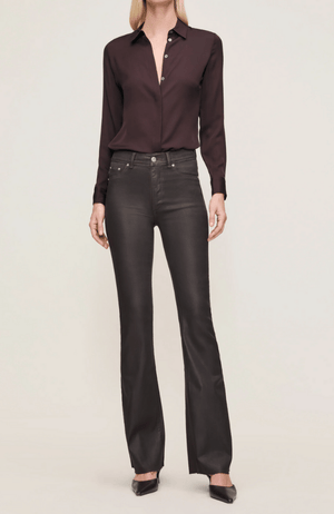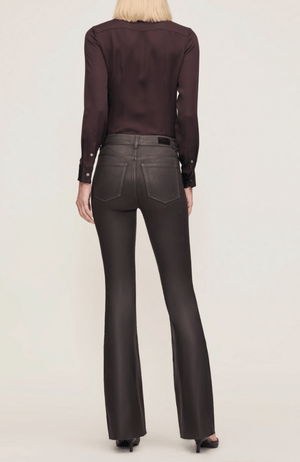 The Bridget High Rise Instasculpt Boot in Chocolate Coated offers a flattering bootcut silhouette with a 33" inseam, expertly designed to sculpt and smooth for a flawless fit. Crafted from dark brown coated denim, it features refined silver hardware, subtle tonal stitching, a distinctive raw hem, and a sleek black back patch, combining modern edge with timeless elegance.