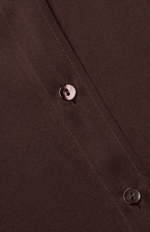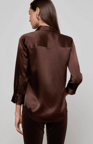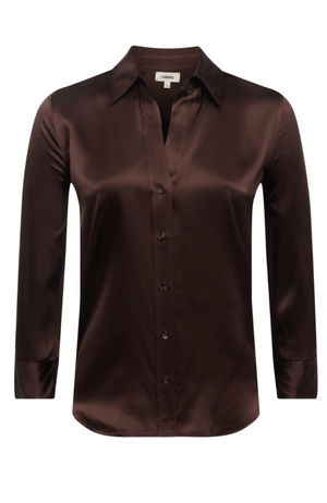 Elevate your wardrobe with the DANI Silk Blouse in Coffee Bean, crafted from luxurious 100% silk charmeuse. Its slim fit and high-low shirttail hem offer a modern silhouette, while the signature three-quarter sleeves bring effortless elegance. Finished with a classic front button closure, this blouse blends timeless style with refined comfort.