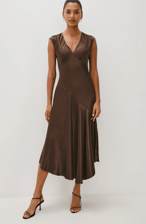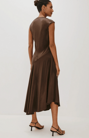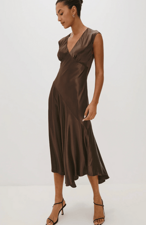 The Eleni Dress in Espresso features luxurious satin crepe fabric that gracefully drapes the silhouette. Its cap sleeves and delicate shirring details enhance the refined design, while the asymmetrical skirt adds a modern, elegant touch. Perfect for occasions where sophistication meets contemporary style.