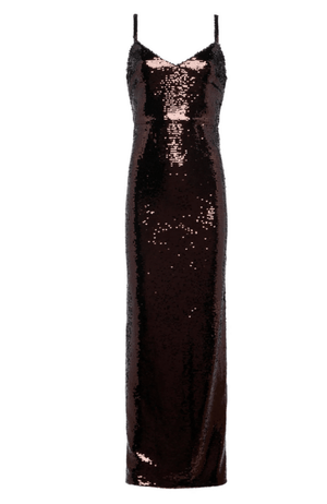 This Karma Sequin Maxi Dress in a rich chocolate hue features an allover sequin design that catches the light with a liquid-like shimmer. Its structured bodice enhances the silhouette, creating a flattering and elegant look. A high back slit provides both movement and grace, making it perfect for special occasions that demand refined style and effortless comfort.