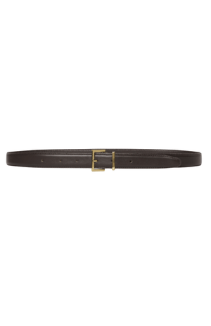 Elevate your wardrobe with this dark brown leather belt featuring a sleek squared gold buckle. Designed with clean edges and a soft, smooth texture, it offers a refined touch to denim, trousers, or crisp shirts. This essential accessory combines timeless elegance with subtle sophistication, making it a versatile foundation for any polished look.