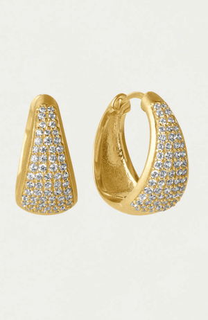 Elevate your style with the Margaux Pavé Huggie Hoops in Gold. These teardrop-shaped earrings feature delicate petit pavé cubic zirconia stones that shimmer gracefully across a brushed 22 karat gold-plated surface. Hand-set with precision over high-quality brass, they offer a refined, enduring elegance perfect for sophisticated everyday wear.